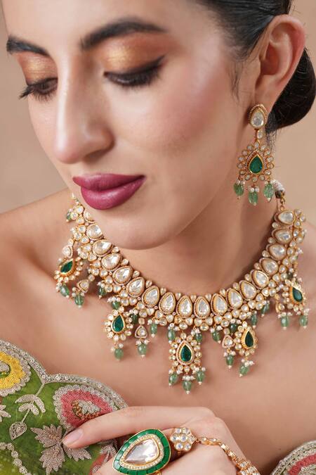Emerald Green Pearls, Stones, Beads Moissanite Polki Choker Set