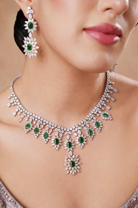 Rhodium plated with floral drop pattern, Studded with clear Swarovski crystals, Emerald green stone accents