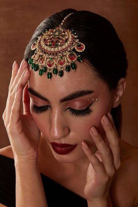 Gold maangtikka featuring intricate navratan stone embellishments