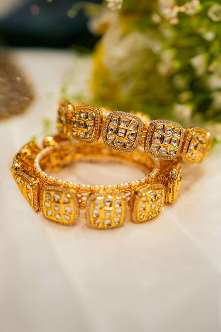 Gold pacheli bangles featuring clear polki stone studded geometric patterns. Set includes two bangles embellished with pearl details.