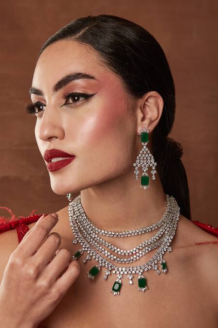 Emerald Green Diamonds, Embroidery Liam Four Layered Embellished Necklace Set