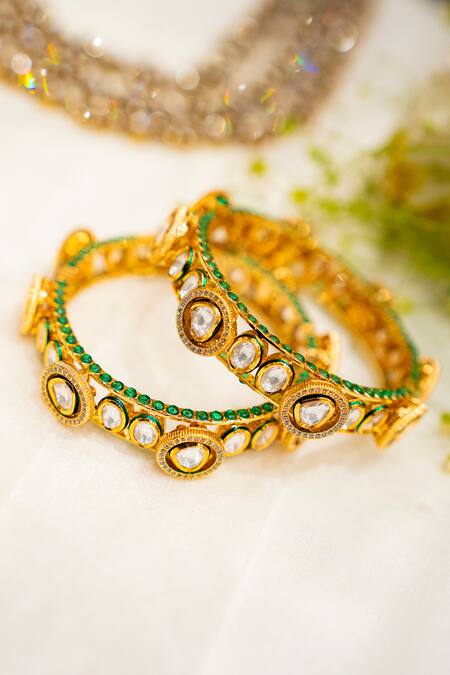 Emerald green pacheli bangles featuring clear polki stone studded round patterns. Set includes two bangles with a screw closure and crafted from silver alloy base.