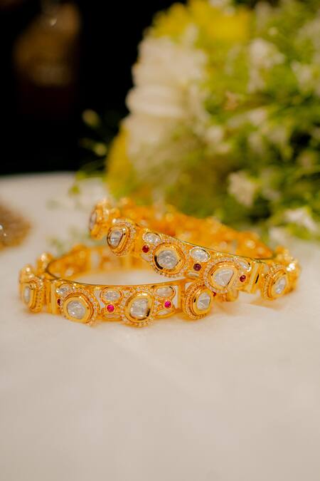 Gold bangles featuring clear polki stone studded geometric patterns. Set includes two bangles with a screw closure.