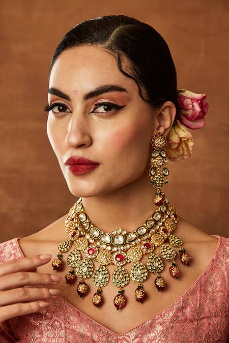 Gold necklace set featuring meenakari polki embellishments with pear drop design. Paired with matching earrings that complement the necklace.