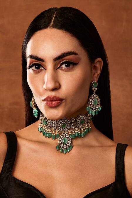 Gold and green moissanite polki embellished necklace with adjustable dori closure. Paired with matching earrings featuring intricate floral designs and dangling accents.