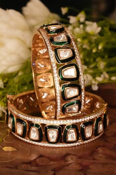 Buy_Ekathva Jaipur_Emerald Green Imitation Diamonds Shea Polki Studded Geometric Bangles-Set of 2_Online_at_Aza_Fashions