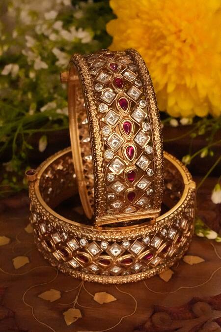 Gold kadas embellished with ruby polki and moissanite polki. Set of 2 featuring intricate design and screw closure.