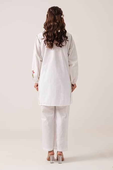 White Poplin Embroidery Floral Round Neck Amba Floret Tunic With Pant