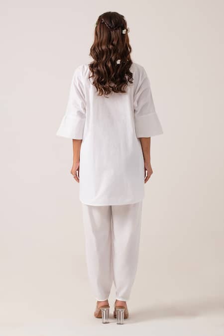 White kurta featuring placement floral motif embroidery and a round neckline. Paired with matching pants for a complete look.