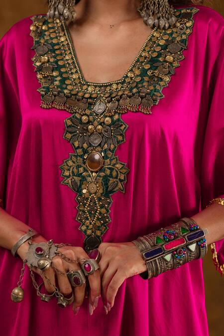 Teal green patch on the placket, Floral and tribal coins embroidery on sleeves, Coin laced cuffs