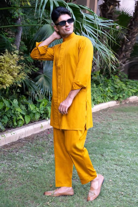 Yellow kurta featuring a mandarin collar, full cuff sleeves, and front button placket. Paired with straight pants that have an elasticated waist and side pockets.