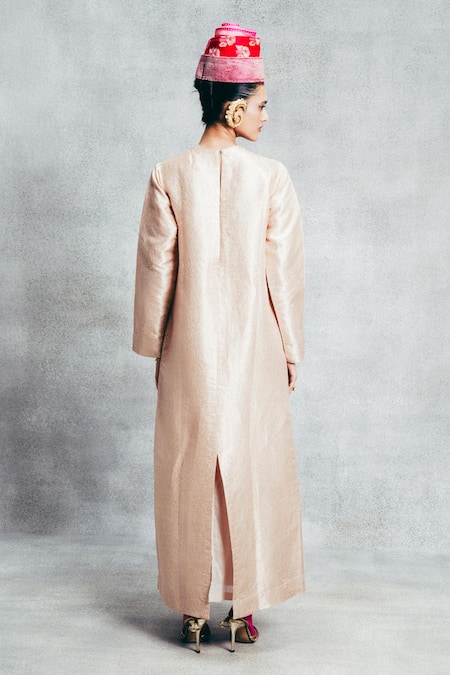 A champagne gold kaftan is handwoven in Banarasi Emboss technique and crafted in satin-silk.