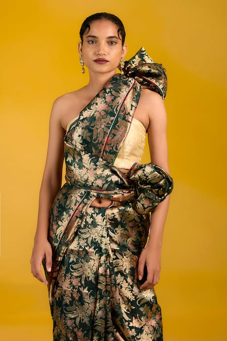 Bottle green saree made from Banarasi kora tissue featuring intricate floral patterns. Paired with a coordinating sleeveless blouse.