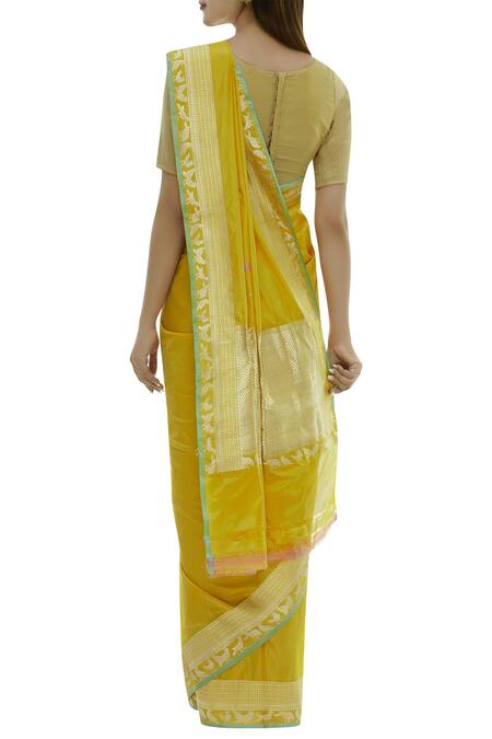 Buy_Ekaya Banaras_Yellow Silk Banarasi Saree With Unstitched Blouse Fabric_at_Aza_Fashions