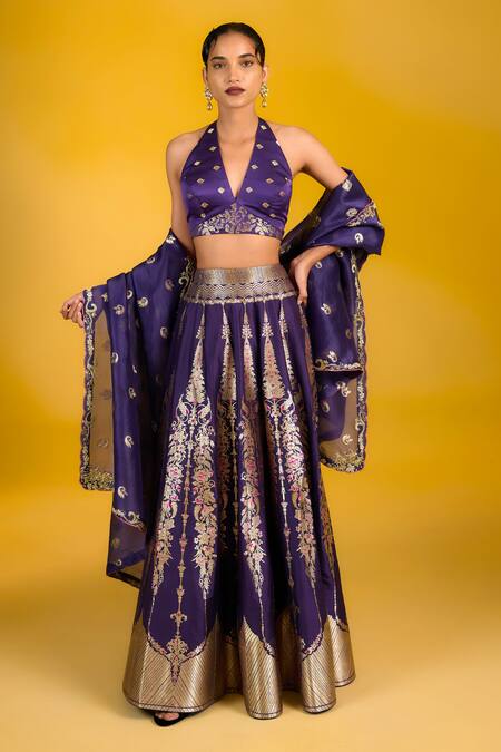 Purple Banarasi silk lehenga set featuring intricate kadhwa work. Paired with a matching choli and dupatta adorned with elegant embroidery.