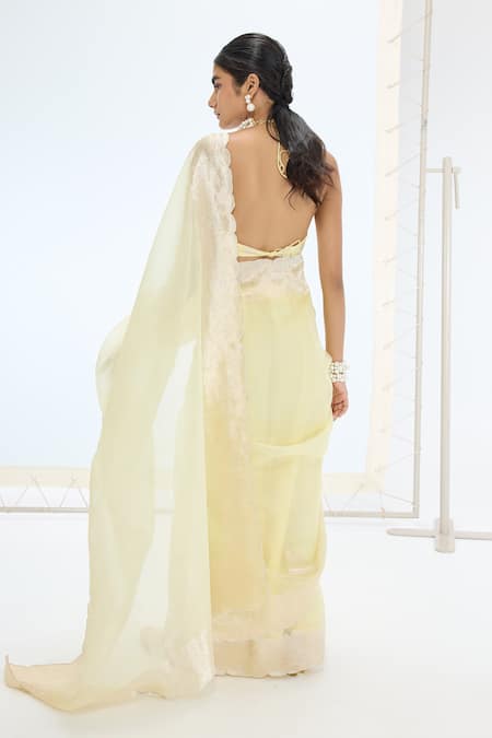 Designer lemon saree crafted from organza and Kora silk featuring handwoven silk organza with Kadhwa technique and pearl hand embroidery. Accompanied by an unstitched blouse piece.