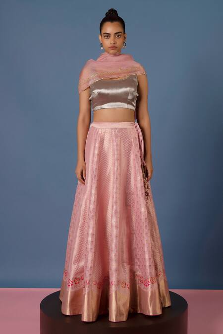 Pink Silk Handcrafted Bridal Lehenga Set With Unstitched Blouse Fabric