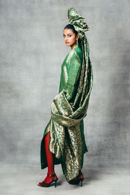 Fusion style blending Indian Banarasi craft with a global silhouette