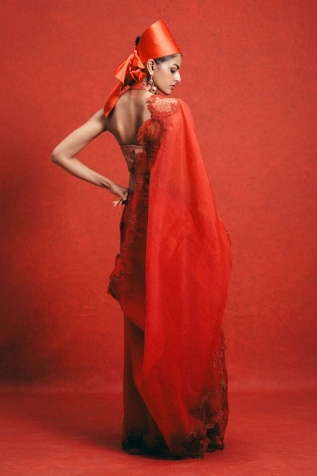 A handwoven red Kora Banarasi silk saree featuring fine embroidery and scalloped edges.