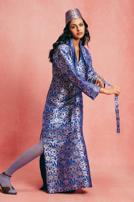 A royal blue kaftan crafted from pure silk, handwoven in Kadhwa Banarasi technique.