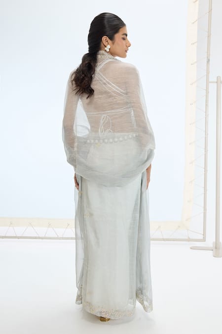 Sea green saree crafted from handwoven crushed silk tissue featuring pearl hand embroidery. Paired with an unstitched blouse component.