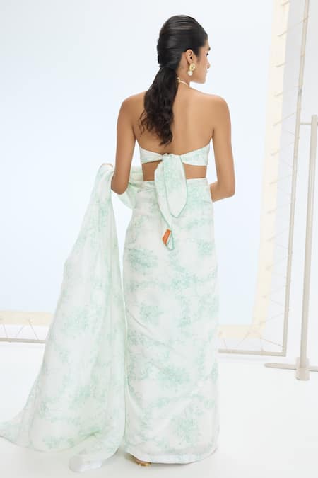 Pearl hand embroidery on the blouse, Digital floral print on the saree