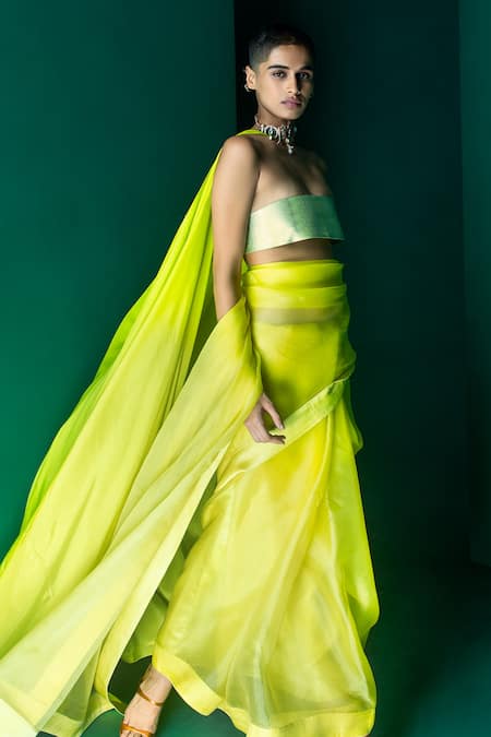 Yellow handwoven saree in organza fabric with an unstitched blouse fabric. Saree length is approximately 5.5 meters with a width of 45 inches.