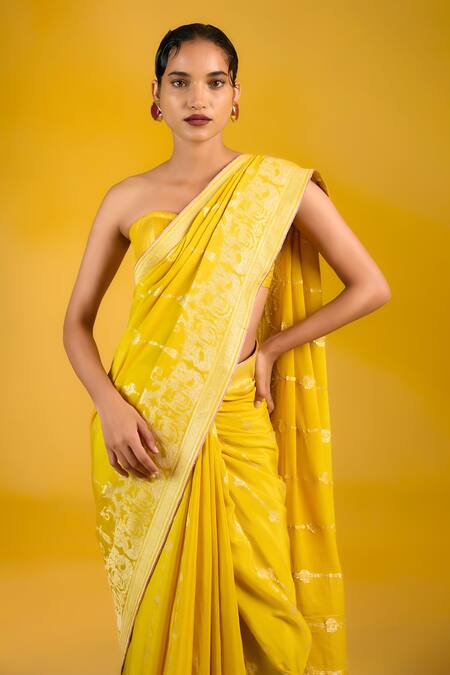 Mustard yellow saree handwoven in lightweight chiffon moonga. Paired with a matching blouse piece.