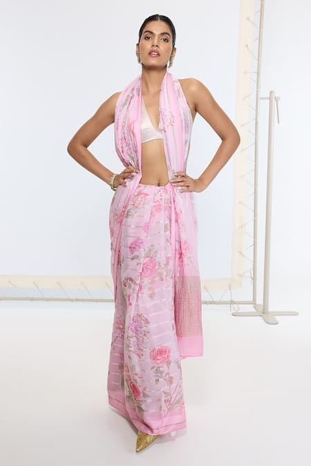 Pink printed georgette saree featuring a running blouse piece.