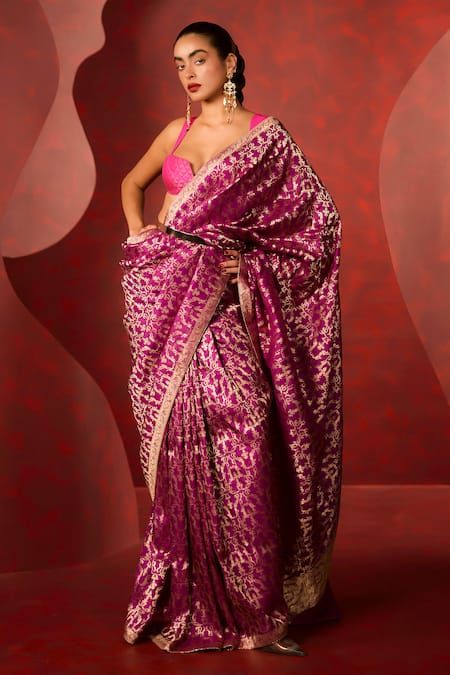 Intricate cutwork emboss design throughout the saree., Contrasting border detailing enhancing the overall look.