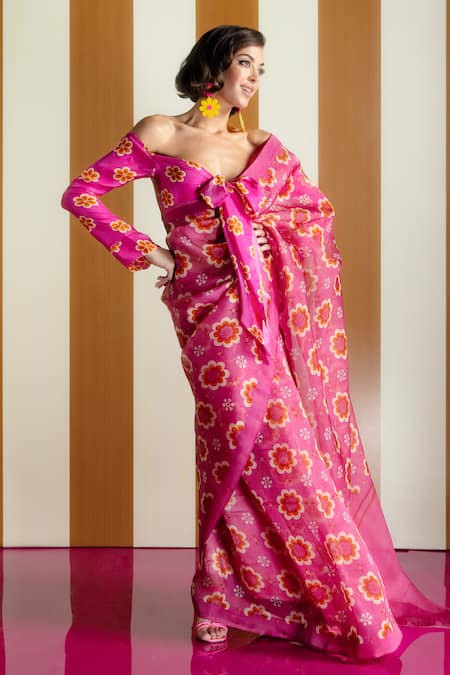Rani pink saree in gossamer organza featuring bold retro floral digital prints. Paired with a matching blouse piece for a complete look.