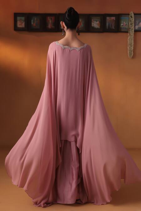 Pink gown made from chanderi and georgette featuring a flowing cape design