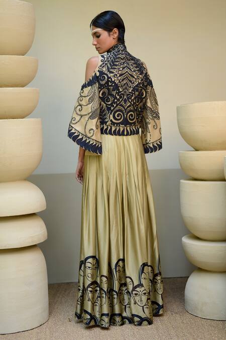 Beige cold shoulder sleeve jacket featuring high neck and mandala design hand embroidery. Paired with a pleated skirt showcasing a portrait print at the hem.