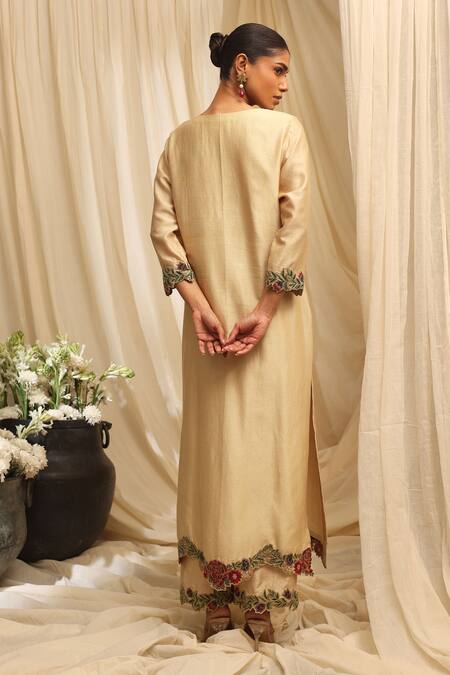 Shop_Ekru_Gold Chanderi, Bamboo Embroidery V-neck Botanic Cluster Kurta Set_Online_at_Aza_Fashions