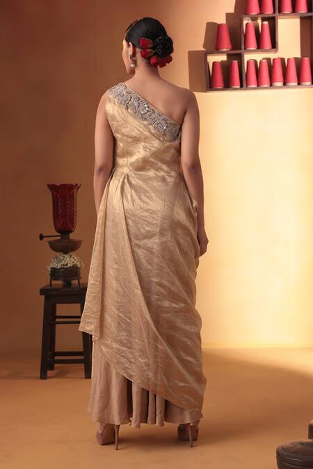 Gold gown featuring a draped design with one shoulder and embellished detailing