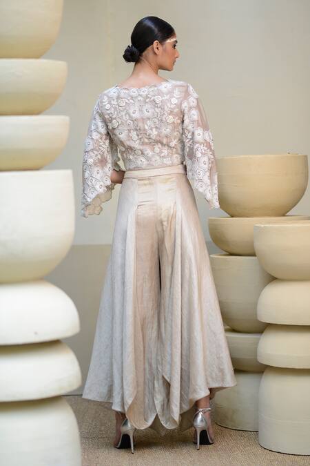 Buy_Ekru_Grey Organza, Linen Embroidery Round Neck Floral Crop Top With Balloon Pant_Online_at_Aza_Fashions