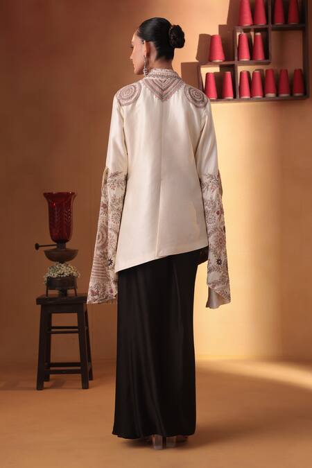 Ivory and black jacket featuring intricate embroidery with a drape skirt. The jacket is crafted from Chanderi and modal satin, providing a luxurious feel.