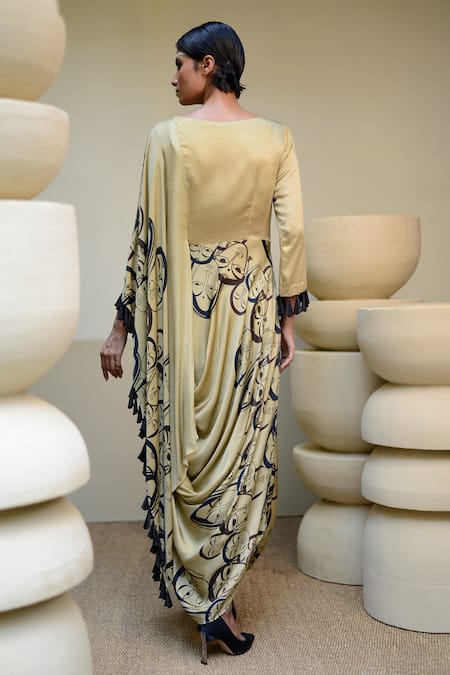 Beige Chanderi, Modal Tassels Round Neck Human Portrait Print Drape Dress