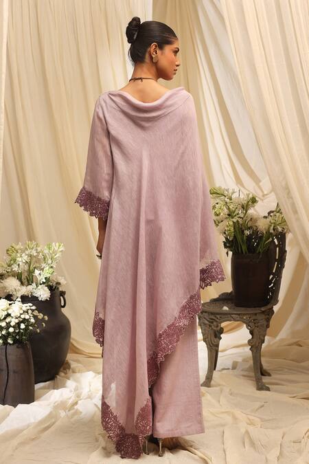 Lavender asymmetric tunic featuring a draped design with lace detailing. Paired with matching pants for a cohesive look.