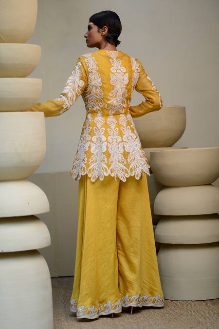 Yellow tunic featuring all-over mandala embroidery with sequin work and a V neckline. Paired with a sharara featuring an embroidered hem.