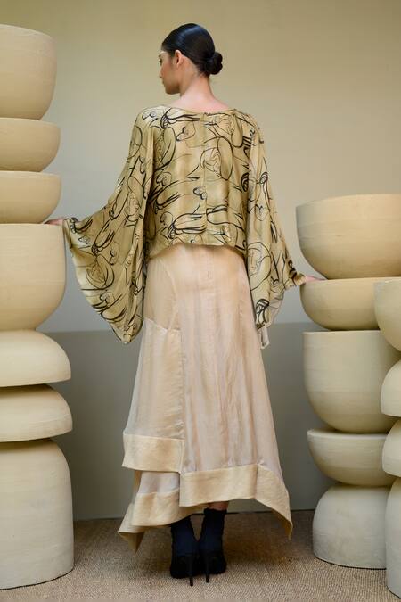 Beige bell sleeve top featuring a mother & child figurine print. Paired with a broad panelled asymmetric skirt.