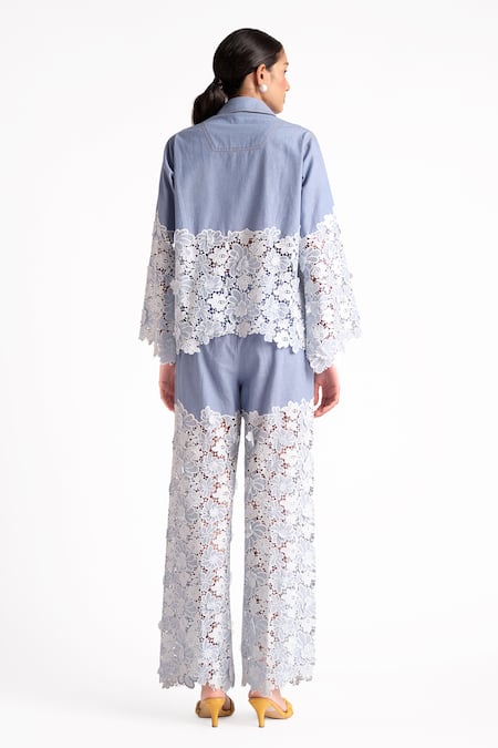 Blue denim shirt featuring a collared neckline and full sleeves with lace detailing. Paired with matching straight pant also adorned with lace accents.