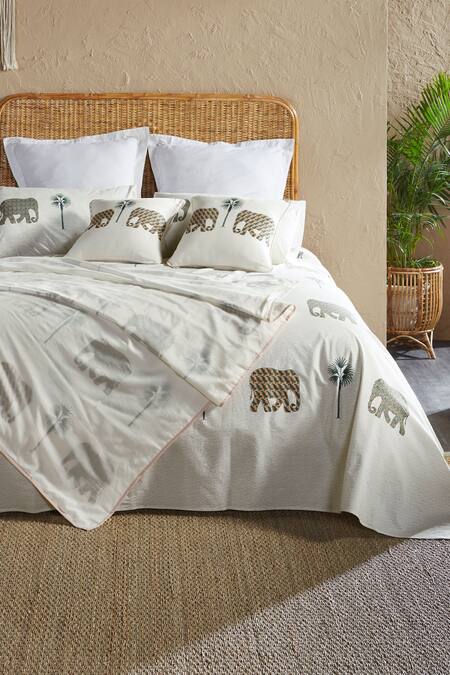 Blue, cream queen bedsheet in cotton base with elephant block print. Comes with pair of pillow covers.