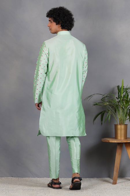 Green silk kurta with foil mirror embroidery & mandarin collared neckline. Paired with pant.