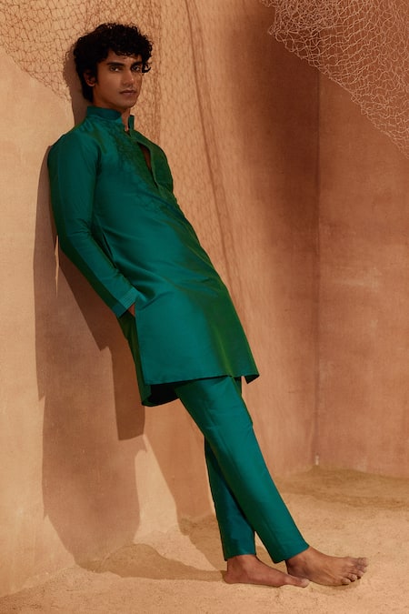 Green silk kurta featuring a Nehru collar and long sleeves with thread embroidery on the placket and sleeves. Paired with matching cotton silk pants.