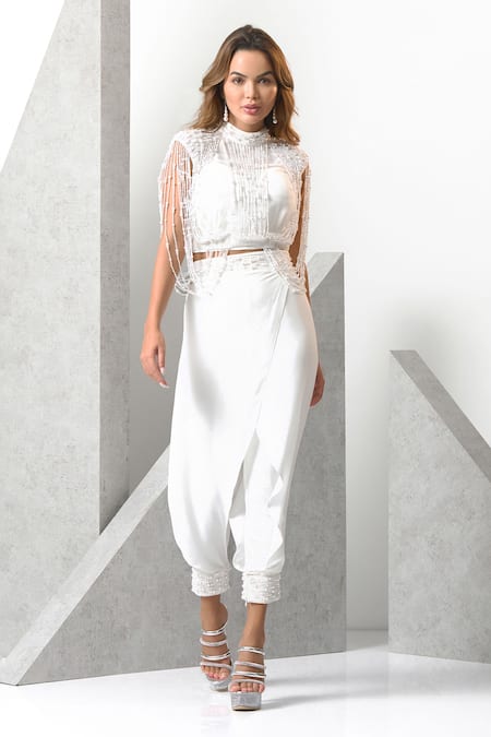 White Chiffon, Crepe, Polyester Pearls, Tassels Hand Embroidered Top With Pant