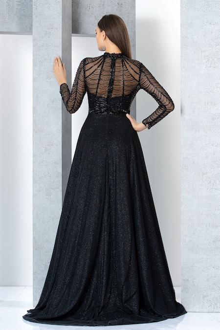 Black Polyester Cut Work, Beads, Crystals High Neck Embellished Gown