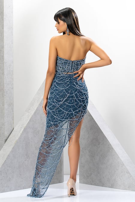 Blue gown featuring a sweetheart neckline and strapless design