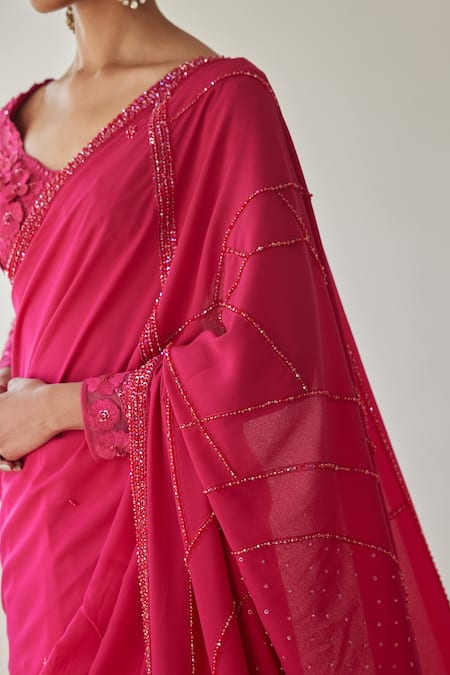 Fuchsia saree in crepe featuring floral embroidery with sequin and bead work. Paired with an embroidered padded blouse and an underskirt made of stretch satin.