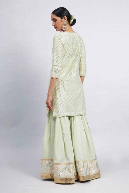 Mint green straight short kurta with ghunghro placket, gota trims & placement floral motifs. Comes with gharara & embroidered dupatta.